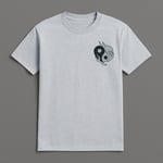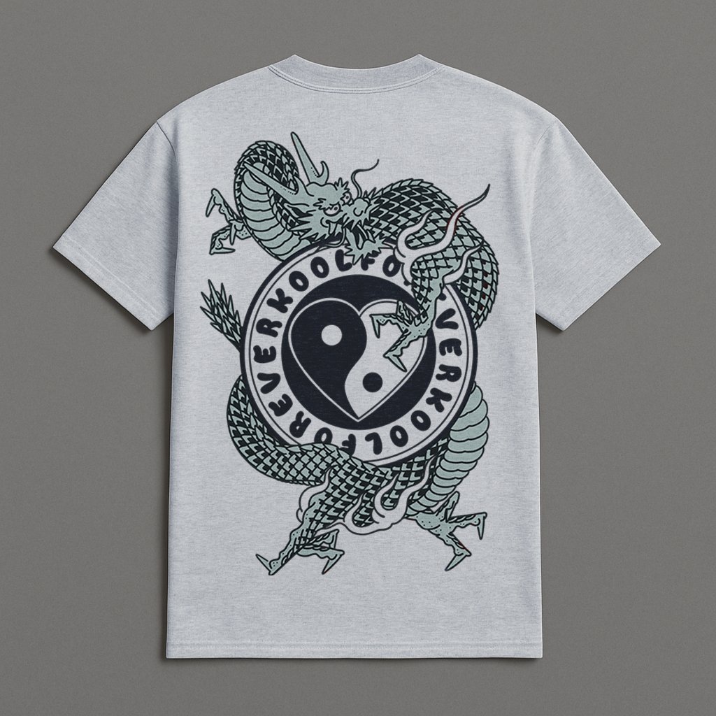 Super high quality color print. Small YinYang Logo as front pocket print, big dragon on the back. Shirt Color is an ash-grey.
