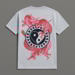 Super high quality color print. Small YinYang Logo as front pocket print, big dragon on the back. Shirt Color is an ash-grey.